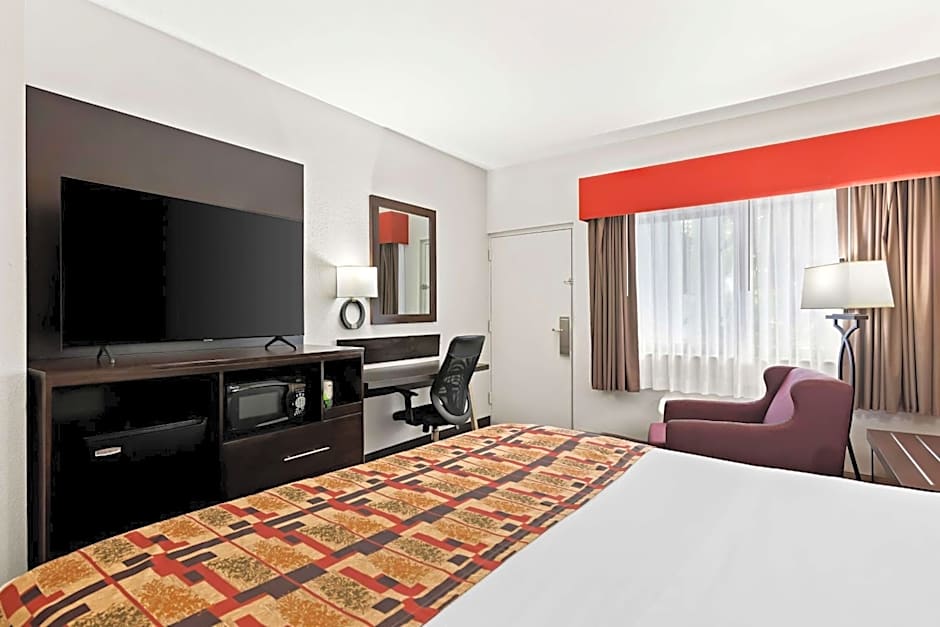 Located on an upper floor, this guestroom features a microwave, small refrigerator, and cable flat-screen TV.